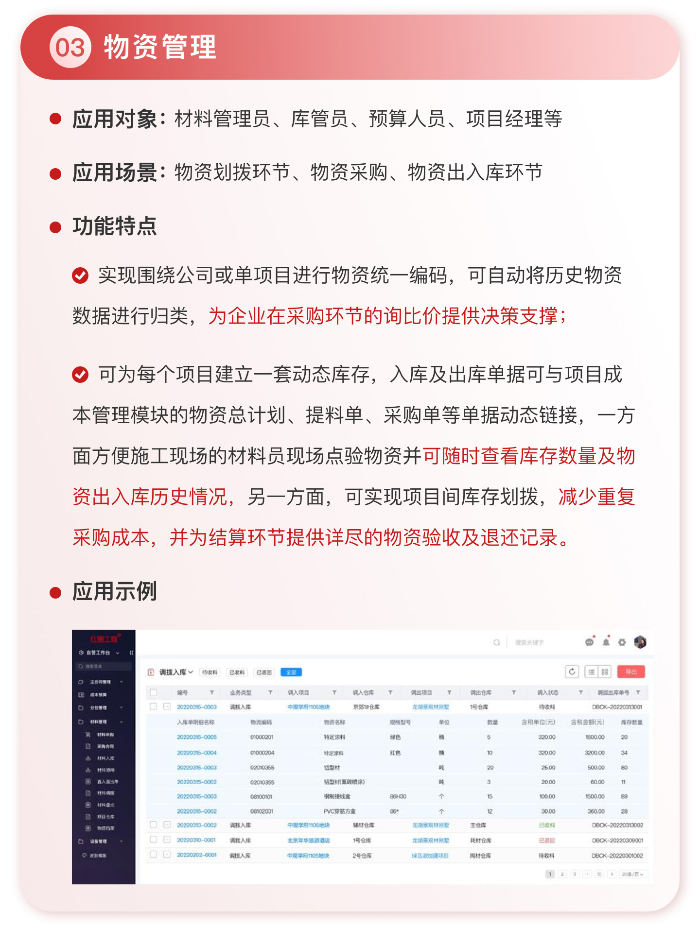 在工程項目管理領域,紅圈在 PaaS 平臺基礎上深入結合建筑工程企業的業務場景,針對其現金流管理薄弱、成本不可控、項目進度滯后、質量問題頻發和安全風險較多等痛點,通過資金管理、成本管理、物資管理、安全質量管理、投標管理、勞務管理、證照管理等功能模塊,使執行人員業務流程標準化、透明化。