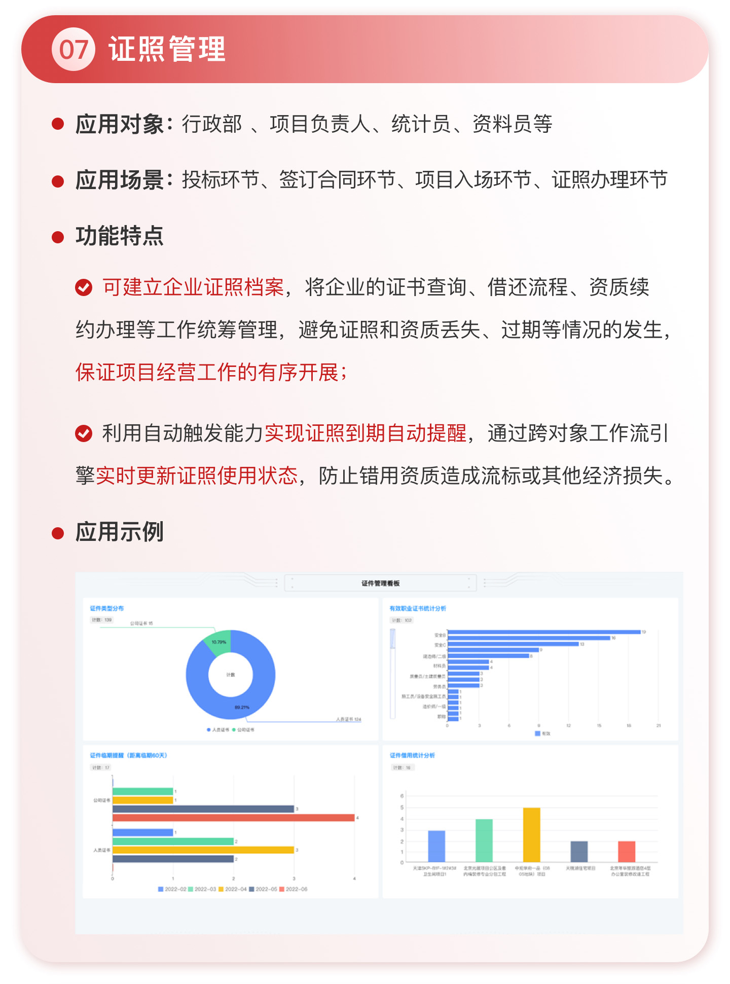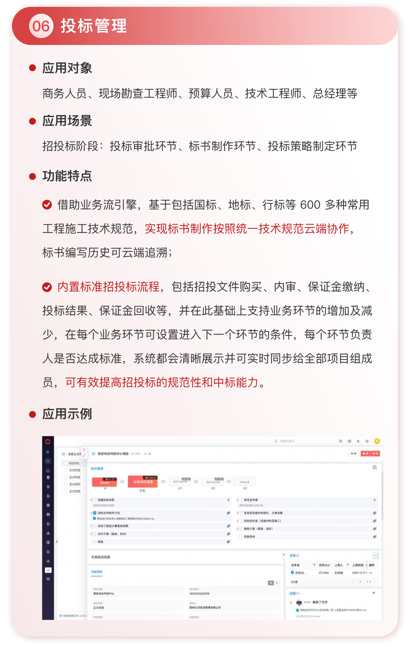 此外,紅圈系統能夠為建筑工程企業決策者實時呈現動態數據、提供智能數據分析,讓管理者實時了解項目的整體運營效率及效益是否達標、經營風險是否可控,滿足建筑工程企業數字化管理升級的需求,提升企業經營管理能力,實現工程項目施工全生命周期的降本增效。該產品主要應用于產值為 5,000 萬-20 億的建筑工程行業企業。