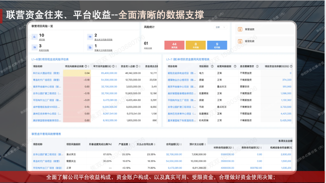 當(dāng)前公司數(shù)字化程度較低,通過簡單的oa軟件、Excel表格、微信群、例會等傳統(tǒng)的管理方式進(jìn)行管理。近幾年隨著公司省外業(yè)務(wù)的拓展,項(xiàng)目越來越大,傳統(tǒng)的低效管理模式已經(jīng)無法滿足日常的管理需求。公司聯(lián)營項(xiàng)目較多,個別項(xiàng)目出現(xiàn)資金挪用,虛開套現(xiàn),造成不必要的法律訴訟官司,甚至資金賬戶被凍結(jié)。此外,公司自營項(xiàng)目,人材機(jī)等各項(xiàng)成本,當(dāng)前人工進(jìn)行把控,項(xiàng)目利潤不達(dá)預(yù)期;人工進(jìn)行統(tǒng)計(jì),需要扒賬,實(shí)效性差,財(cái)務(wù)報(bào)表不能實(shí)時動態(tài)呈現(xiàn)。