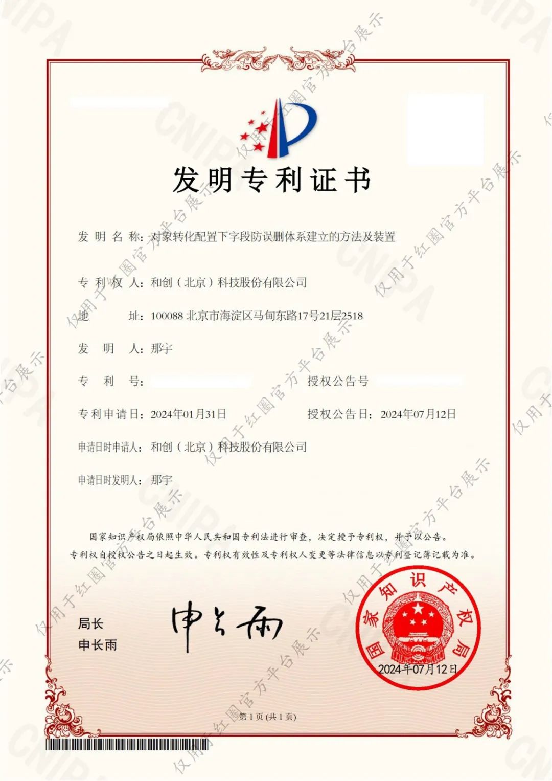 在科技發展日新月異的今天,每一項新的專利都代表著一次技術的革新與突破。近日,和創科技再迎一項技術創新,榮獲最新專利——“對象轉化配置下字段防誤刪體系建立的方法及裝置”