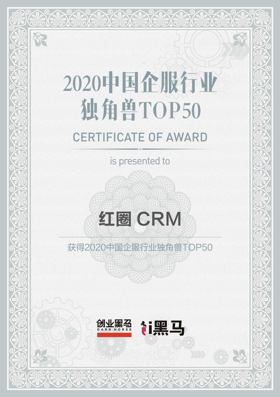 經(jīng)過多輪線上綜合評審會和最終角逐,紅圈CRM 作為 CRM 領(lǐng)域唯一代表企業(yè)入選《2020 中國企服行業(yè)獨角獸 TOP50》,該榜單在 12 月 18 日創(chuàng)業(yè)黑馬主辦的的第十三屆創(chuàng)業(yè)家年會上隆重發(fā)布。