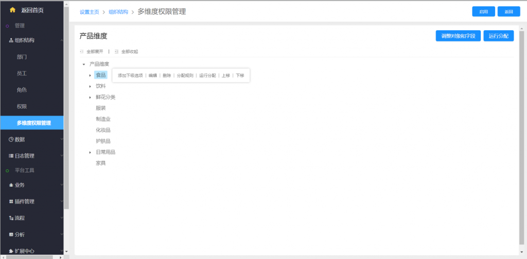 1)在后臺組織架構-多維度權限管理,新建維度樹;創建時需指定適用對象(需要擴展權限的對象)和規則字段(權限劃分的條件依據)
