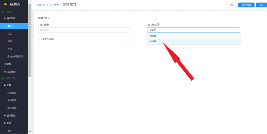 后臺部門設置,增加部門類型,分為職能型和項目型