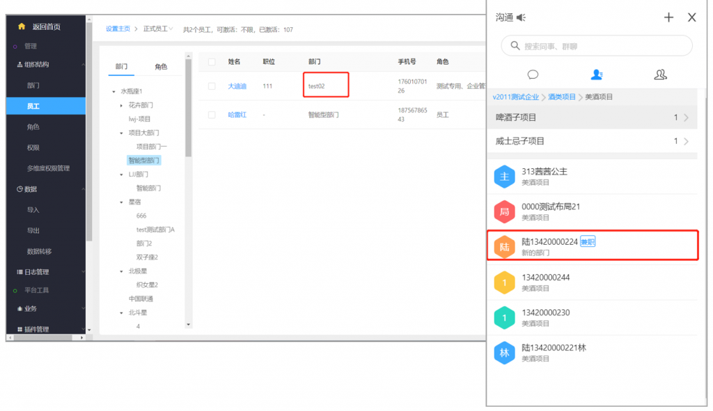 在后臺的員工列表和前臺通訊錄中,會展示所選部門的兼職員工