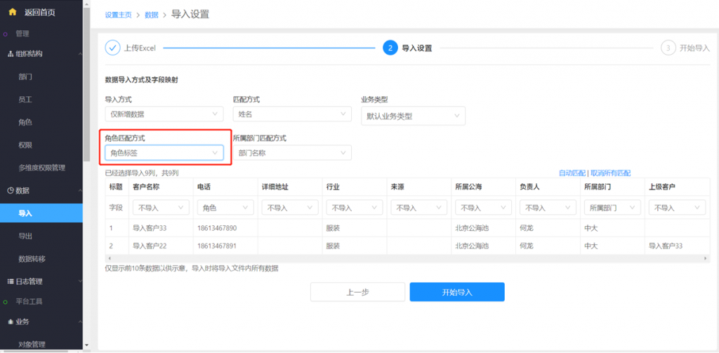 導入員工數據時,支持按中文導入角色,多角色用豎線“|”分隔