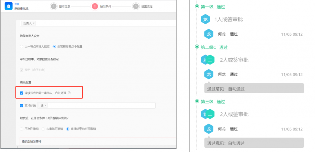 增加高級設置:連續節點為同一審批人,合并處理;第二級審批節點會自動通過