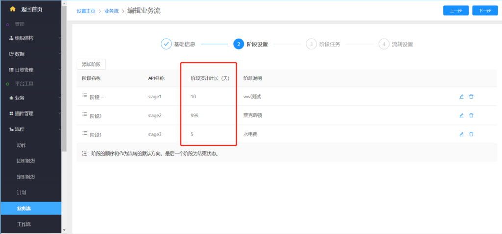 業務流條件階段設置時,可以設置階段預計時長,以天為單位
