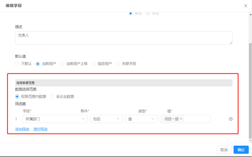 負責人或自定義的員工字段,支持設置篩選條件,在錄入資料選人時,可縮小選取范圍