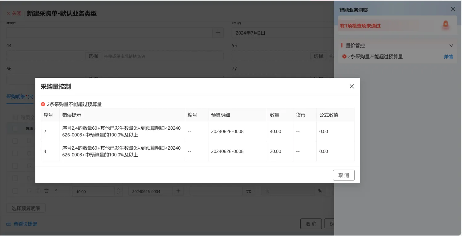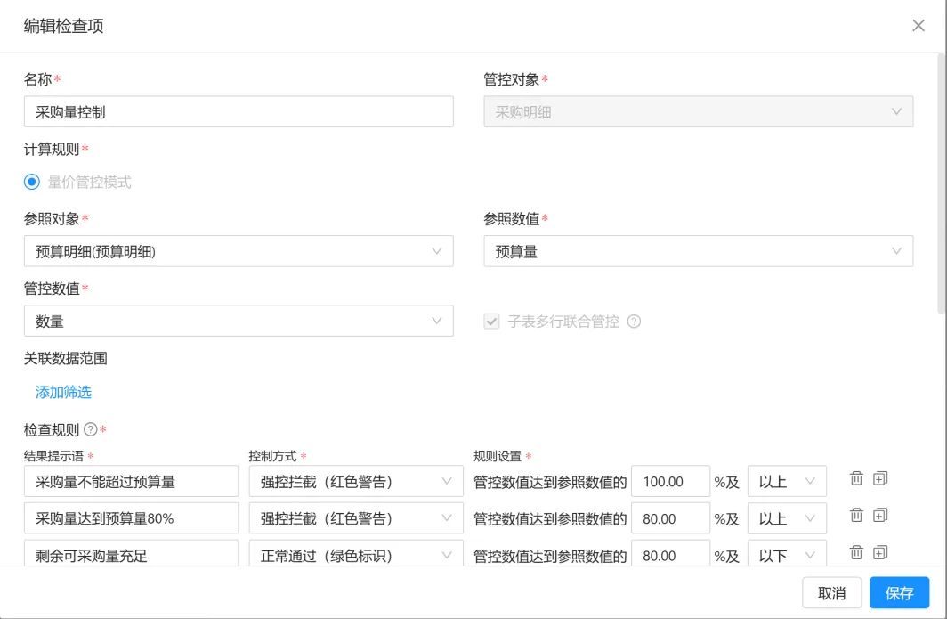 增加對于子對象的管控能力,主要用于支持自主搭建的“預(yù)算→申請→支付或領(lǐng)用”量價管控類場景,并且可以做到子表多行聯(lián)合管控,解決原有驗證規(guī)則無法支持的問題