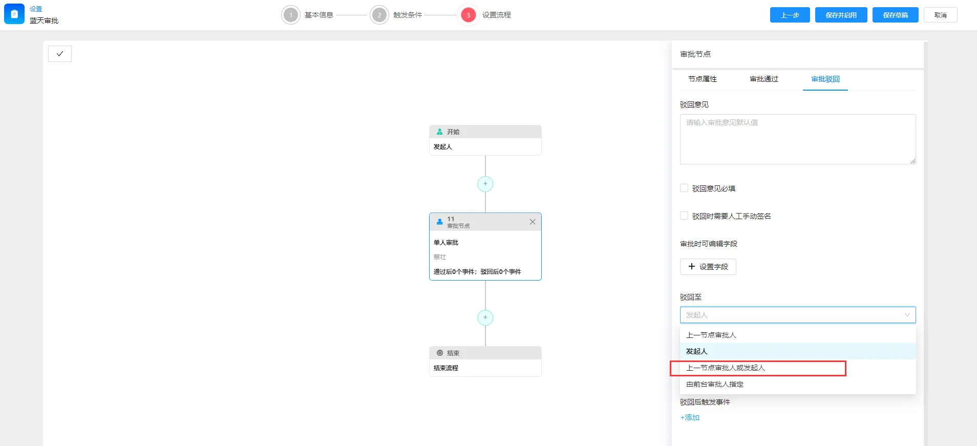 駁回可選駁回至上一節(jié)點或發(fā)起節(jié)點,前臺人員操作時可在上一節(jié)點和發(fā)起節(jié)點中選擇