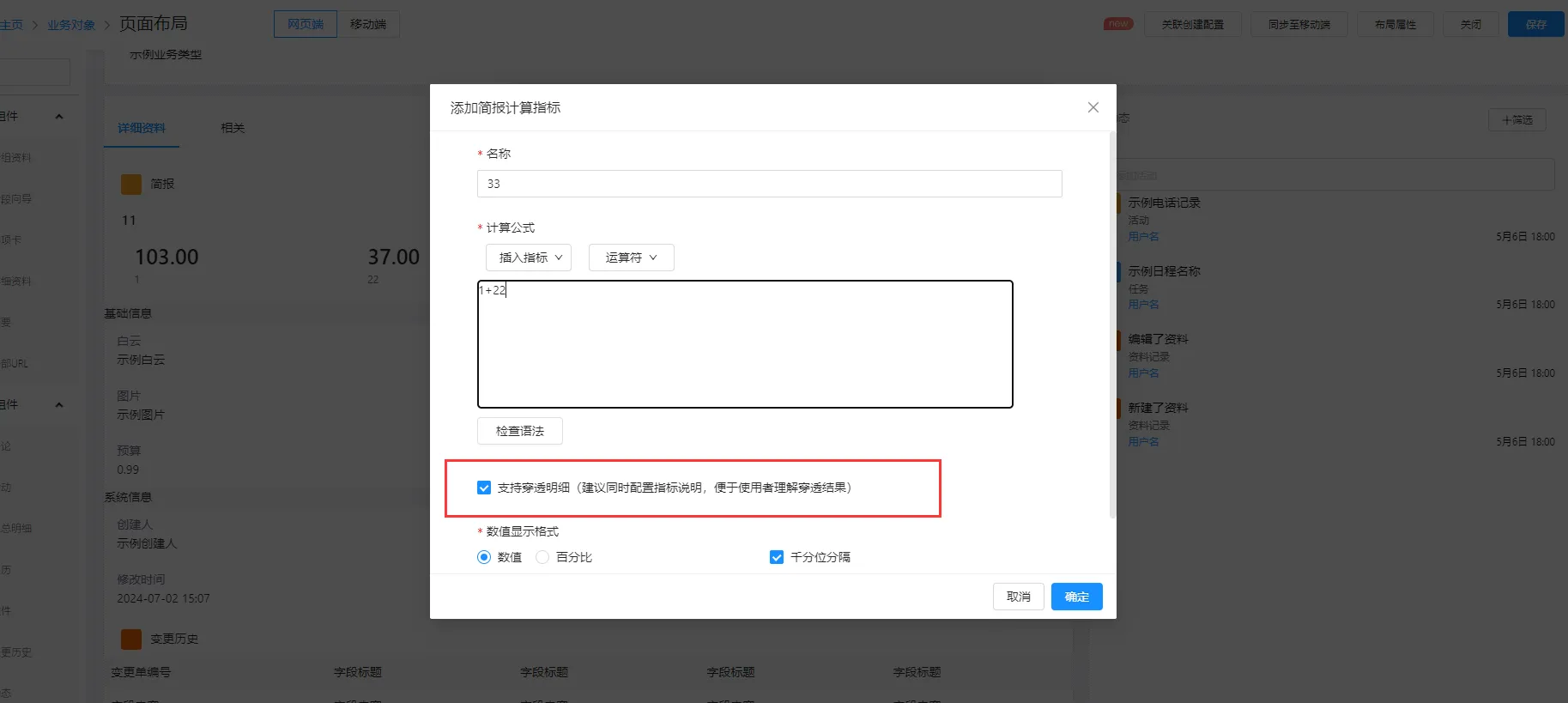 詳情頁簡報中的計算字段勾選支持穿透明細,前臺使用時可以穿透查看所有相關(guān)指標(biāo)對應(yīng)的列表頁數(shù)據(jù)