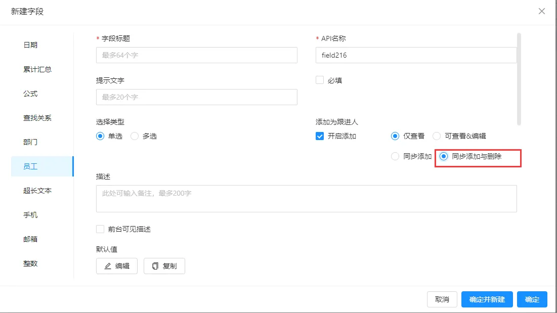 員工字段勾選同步添加跟進人后可以選擇同步添加與刪除,員工字段中刪掉的成員也會同時在跟進人字段中刪除