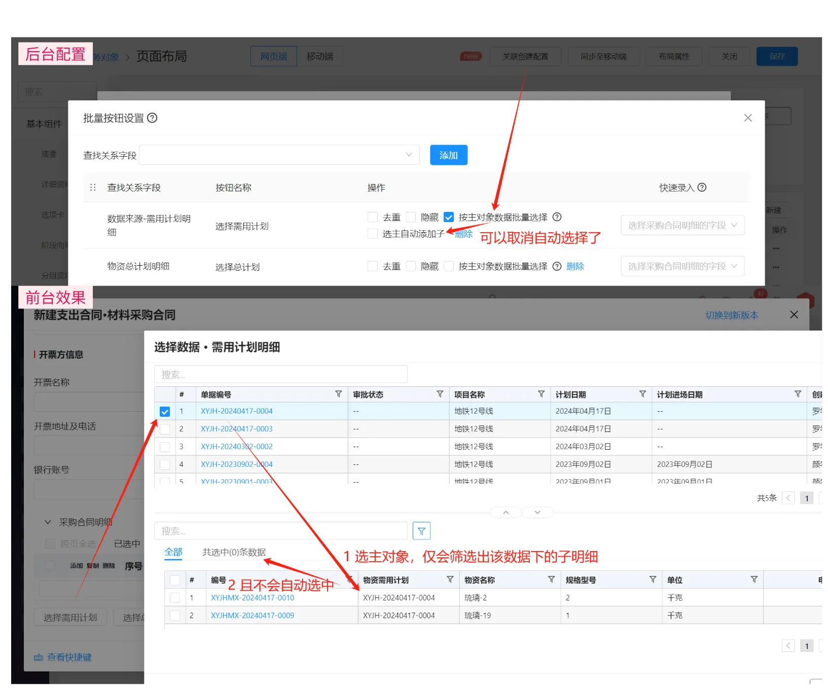6、picker頁選主對象同時選中子明細功能,可以設(shè)置為不默認選中子,僅作為篩選縮小子明細的范圍,方便僅需要選擇部分數(shù)據(jù)的情況