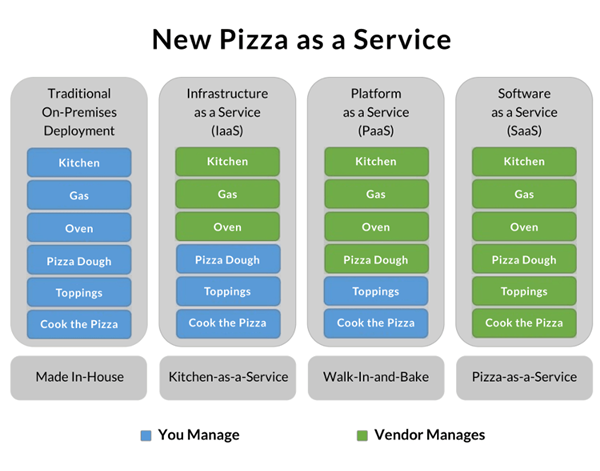 IBM 的軟件架構師 Albert Barron 曾經使用披薩作為比喻,解釋這個問題。David Ng 進一步引申,讓它變得更準確易懂。