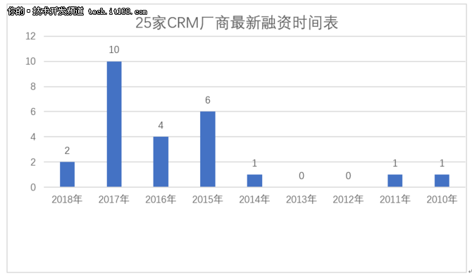 77家網上公開資料搜索到的CRM廠商中有25家是有明確的融資情況,從上圖我們可以看出資本越來越青睞于CRM領域,最新融資情況在2015年-2017年內的廠商共有20家,占比為80%,商業模式的成熟、企業CRM認知的提高以及市場需求或許是資本青睞的主要原因。