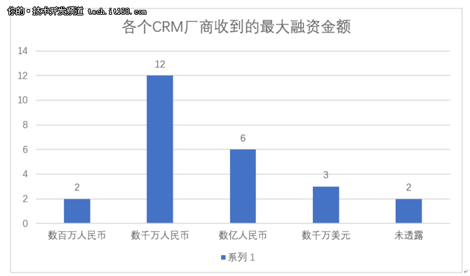 上圖總結了25家CRM廠商收到的最大融資金額, 我們將融資金額分為“數百萬人民幣”、“數千萬人民幣”、“數億人民幣”、“數千萬美元”以及未透露五個類別。其中12家公司收到最大的融資金額是數千萬人民幣。