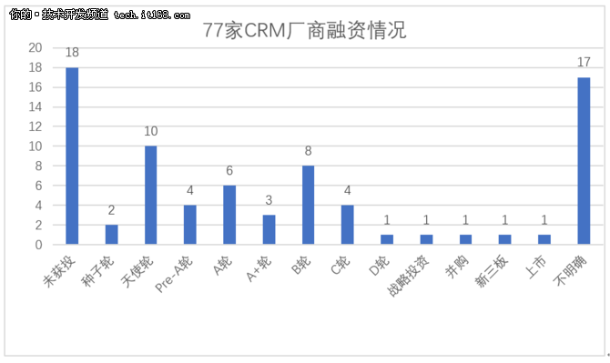 從77家CRM廠商的融資情況來看,除去17家融資情況不明確的廠商,有17家公司至今未獲投,B輪及B輪以前融資的公司有33家,占到總數的55%,相當一部分CRM廠商還處于創業初期。