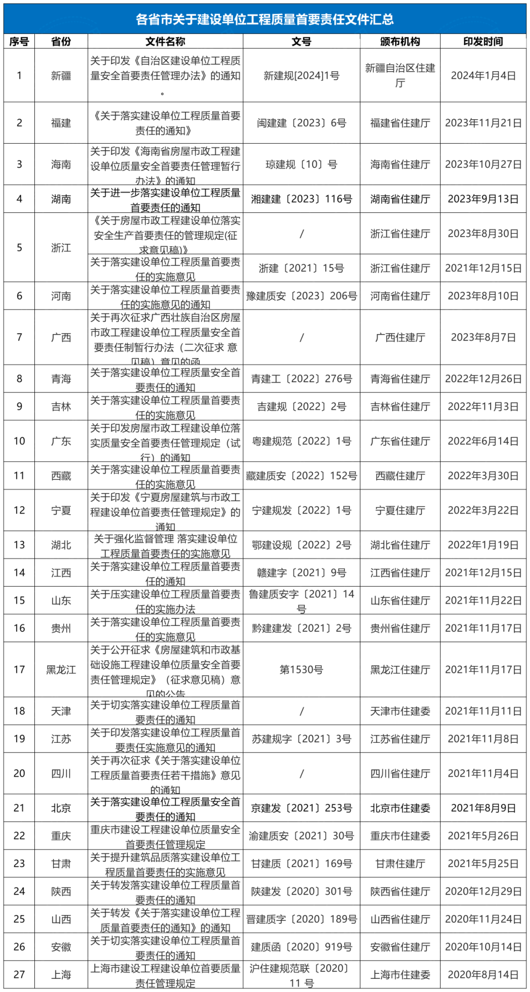 截至目前,27省市已經(jīng)發(fā)文跟進(jìn)住建部《關(guān)于落實(shí)建設(shè)單位工程質(zhì)量首要責(zé)任的通知》(建質(zhì)規(guī)〔2020〕9號(hào)),嚴(yán)格落實(shí)建設(shè)單位工程質(zhì)量首要責(zé)任。