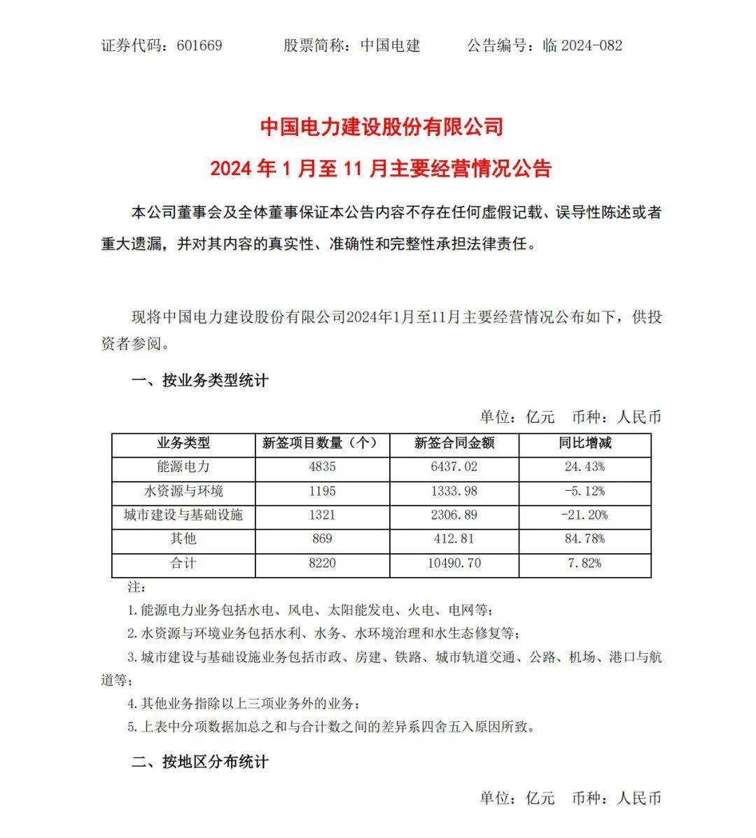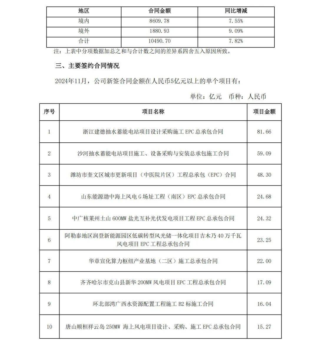 12月20日,中國(guó)電建發(fā)布《 中國(guó)電力建設(shè)股份有限公司2024年1月至11月主要經(jīng)營(yíng)情況公告》,披露了2024年1-11月,2024年11月,公司新簽合同金額在人民幣5億元以上的單體項(xiàng)目共有40個(gè)。