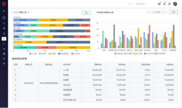 系統支持通過報表引擎橫向對比不同項目的成本數據(如材料費用、機械效率);