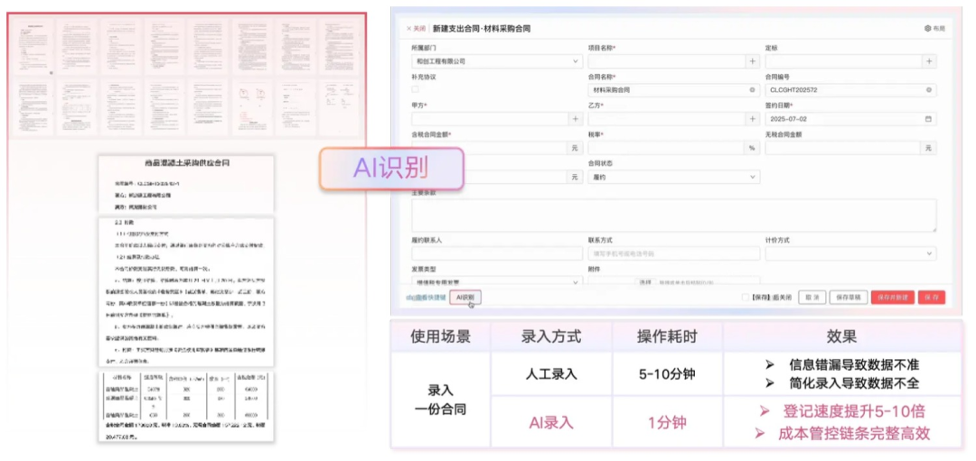紅圈AI錄單助手自動識別合同、結(jié)算、出入庫、發(fā)票等單據(jù)內(nèi)容,并智能歸檔+回填至系統(tǒng)中對應(yīng)字段。