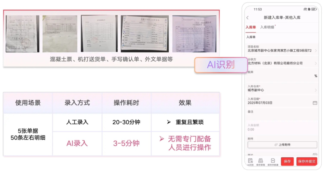 大量手寫確認單、混凝土票據(jù)、支出合同、機打送貨單和辦公登記表的錄入任務(wù),不管是在出差途中或辦公場景中,員工只需將紙質(zhì)單據(jù)拍照上傳,即可實現(xiàn)一鍵識別與系統(tǒng)自動錄入,徹底擺脫繁瑣工作、減少重復(fù)勞動。