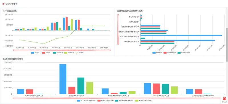 紅圈系統為企業建立了多維度的經營數據可視化報表(包含合同金額/回款金額/開票金額/支付金額/動態利潤金額等),通過精準詳細的常規數據報表、曲線圖報表、柱狀圖報表等多種展示形式,幫助管理層輕松掌握每一個關鍵數據,不受時間地點限制,可實時查看每個項目的經營情況。