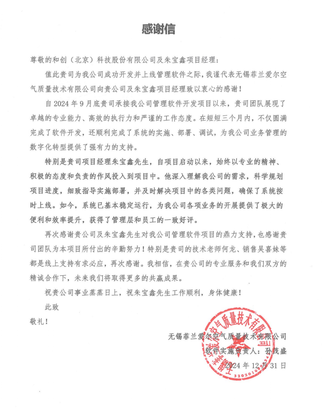 “貴司團隊展現了卓越的專業能力、高效的執行力和嚴謹的工作態度。在短短三個月內,不僅圓滿完成了軟件開發,還順利完成了系統的實施、部署、調試,為我公司業務管理的數字化轉型提供了強有力的支持。”