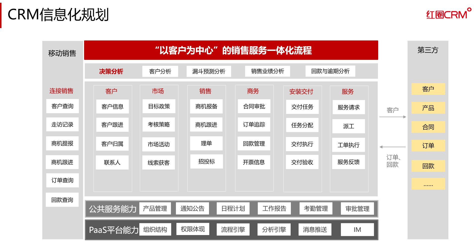 售后服務(wù)等業(yè)務(wù)環(huán)節(jié)都可能會(huì)有產(chǎn)品設(shè)計(jì)與工藝方案的調(diào)整,企業(yè)的業(yè)務(wù)模式具有明顯的多元化、個(gè)性化和碎片化特征,制造業(yè)企業(yè)必然面臨商業(yè)模式和管理模式雙重挑戰(zhàn)。為打通與改善企業(yè)從市場營銷、銷售、研發(fā)、采購、制造到客戶服務(wù)等核心業(yè)務(wù)環(huán)節(jié),借助紅圈CRM打造統(tǒng)一客戶交互平臺(tái),提升管理質(zhì)效,為客戶創(chuàng)造更大的價(jià)值。